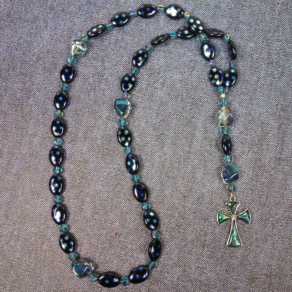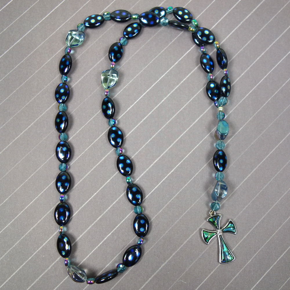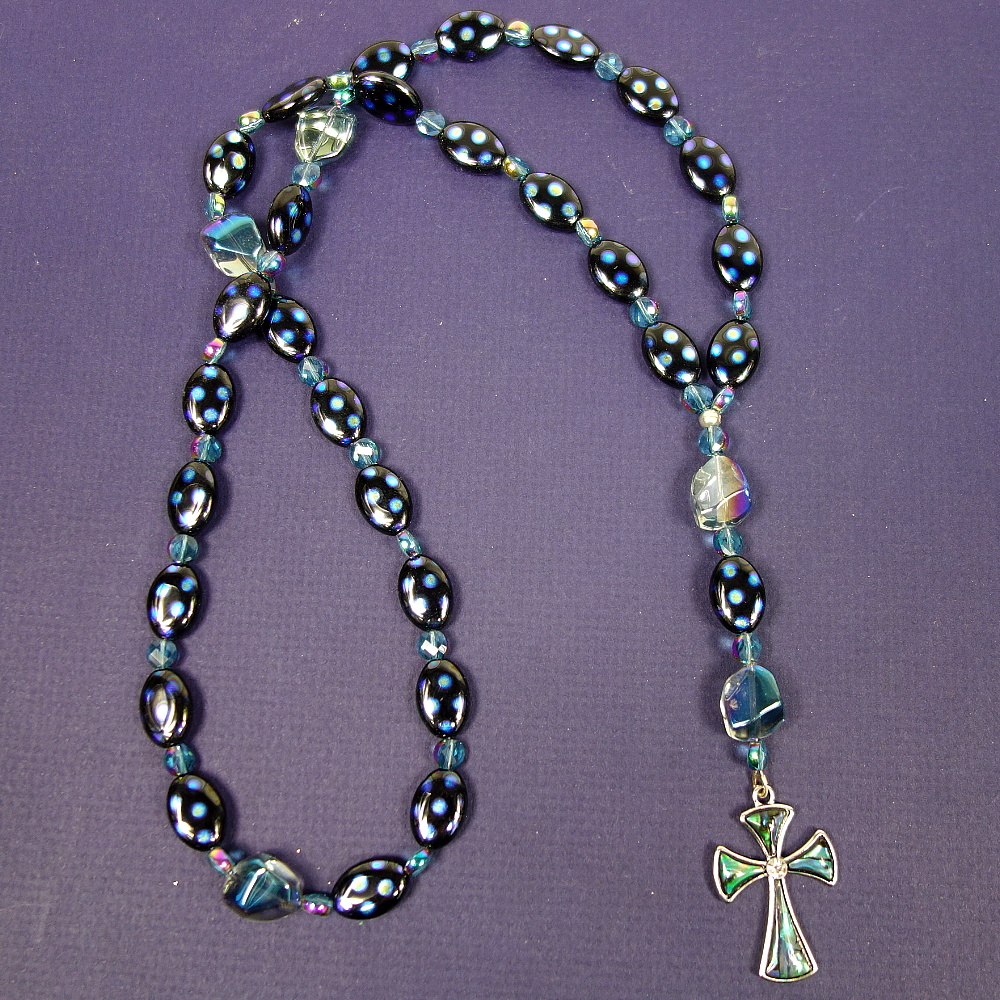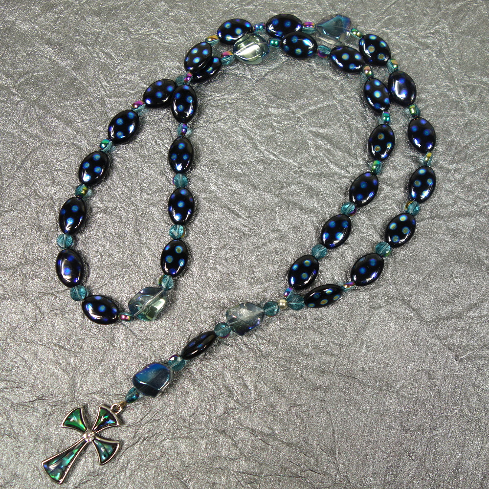 Aqua glass nugget Cruciform beads, blue-dotted black oval disk Week beads, faceted aqua spacer beads, and an abalone rhinestoned cross grace this Protestant prayer bead necklace. Your prayers will definitely be “spot on” when you pray with these beads!