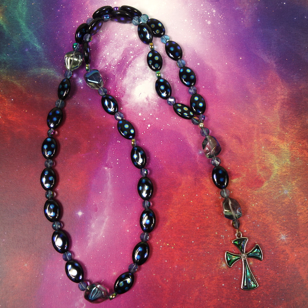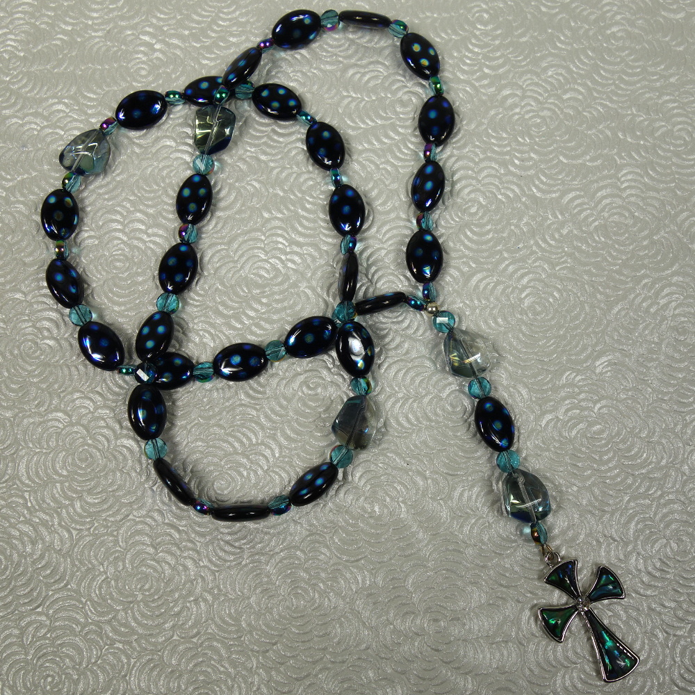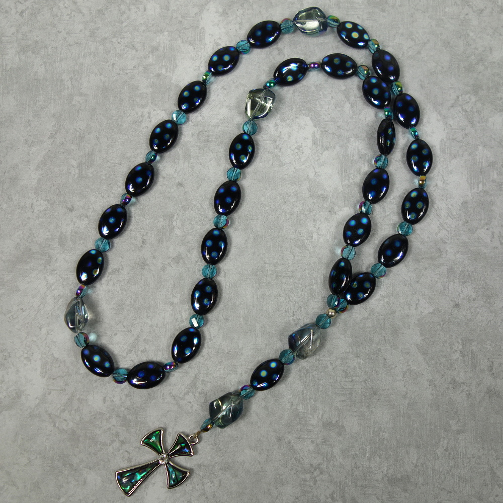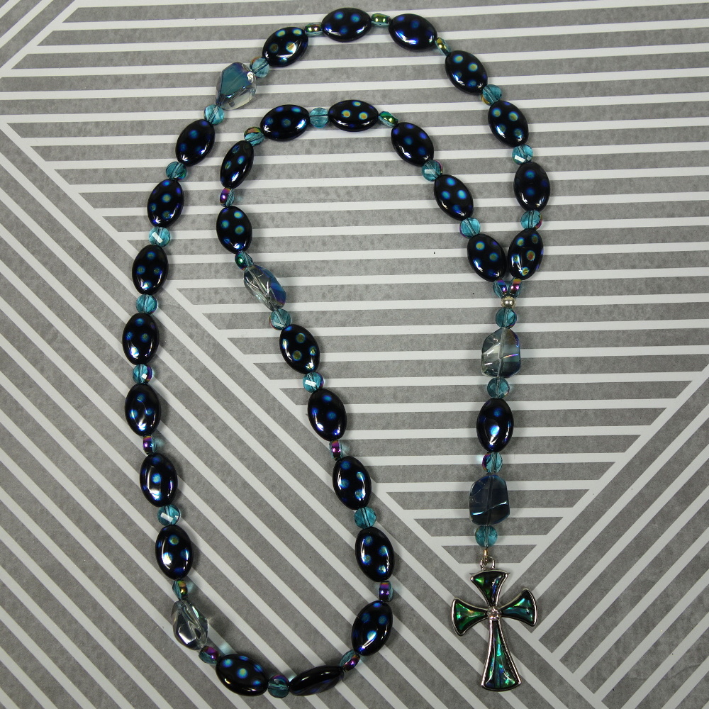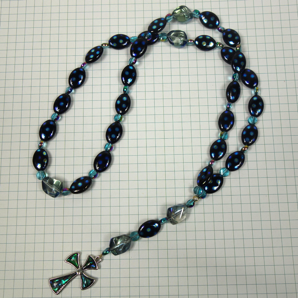 Aqua glass nugget Cruciform beads, blue-dotted black oval disk Week beads, faceted aqua spacer beads, and an abalone rhinestoned cross grace this Protestant prayer bead necklace. Your prayers will definitely be “spot on” when you pray with these beads!