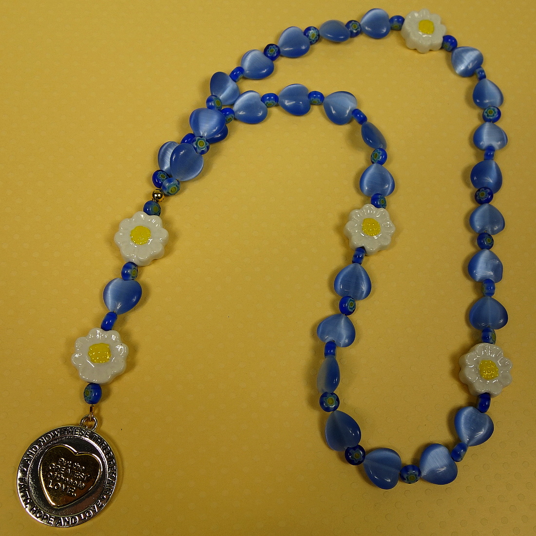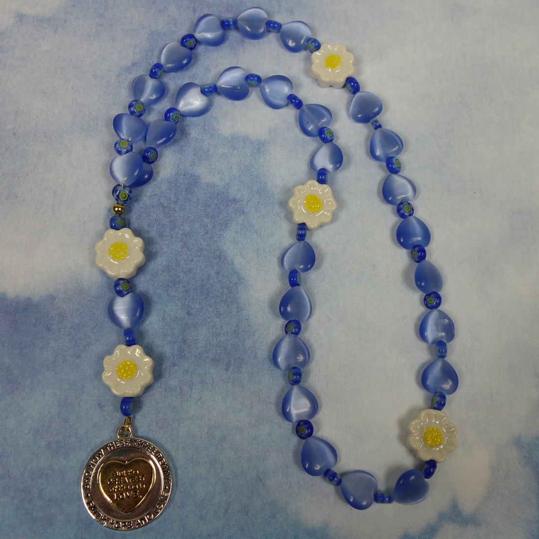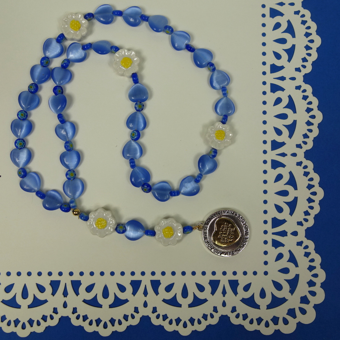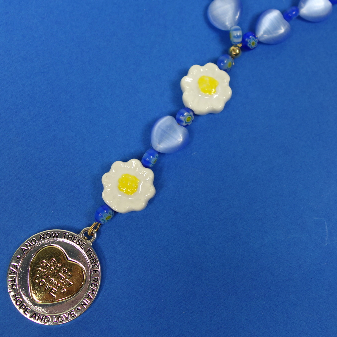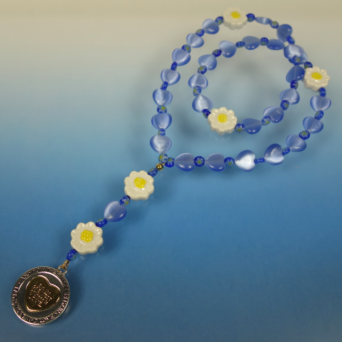 Blue hearts, daisy flowers, and a meaningful spinning-heart pendant grace these sweet Protestant prayer beads. The spinning-heart pendant is embossed with “AND NOW THESE THREE REMAIN FAITH, HOPE AND LOVE” around its rim and “But the GREATEST of these is LOVE” on one side of the spinning heart. Embossed on the other side of the heart is “1 COR 13:13”.