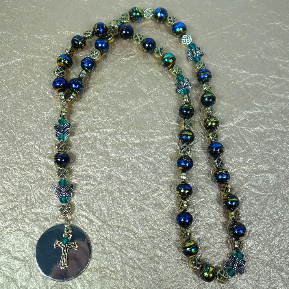 Goldtone metal butterflies, gold-foiled aqua glass beads, and chunky metal cloverleaf beads grace this Protestant prayer bead necklace. Its embossed goldtone metal cross hangs with an aqua dangle atop a goldtone metal disk. Inspirational words embossed on one side of it include: “Passion, Joy, Hope, Courage, Honor, Family, Loyalty, Unity, Kindness, Humor, Love, Trust, Truth, and Charity.” With butterflies for grace, cloverleafs for luck, affirmations for inspiration, and the cross for guidance, what more could you want in a set of prayer beads? Quite the beautiful statement of faith when worn, too.