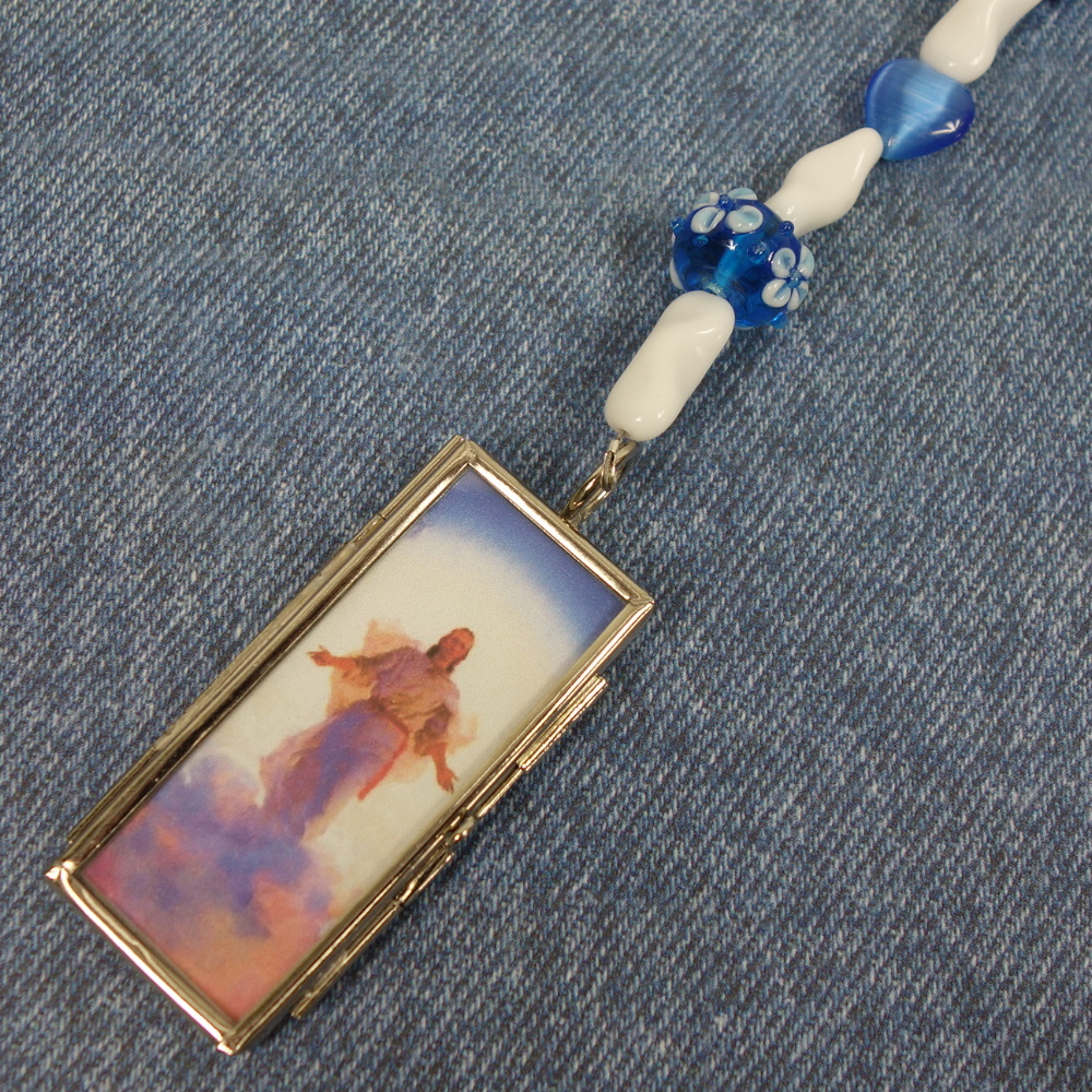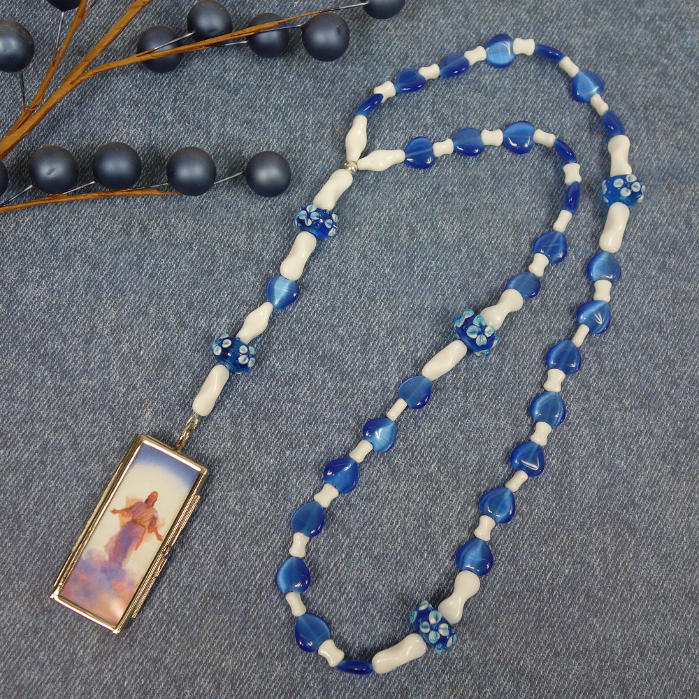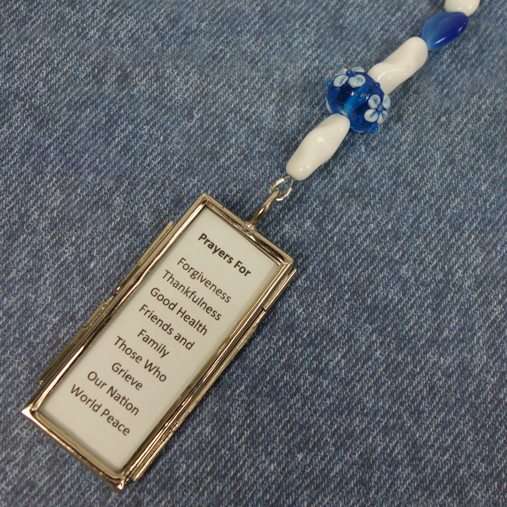 White-flowered blue lampworked glass Cruciform beads, blue cat’s eye glass heart Week beads, white pinched glass tube spacer beads, and a customizable glass windowpane pendant grace this Protestant prayer bead necklace. The windowpane pendant may be opened so anything you desire can be inserted inside and viewed on both sides of the pendant. The pendant comes with a paper insert that has a picture of Christ on one side and a list of prayer topics on the other side.