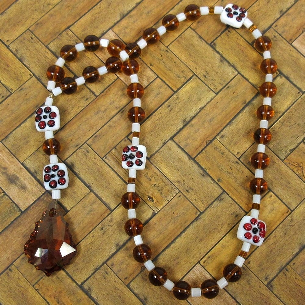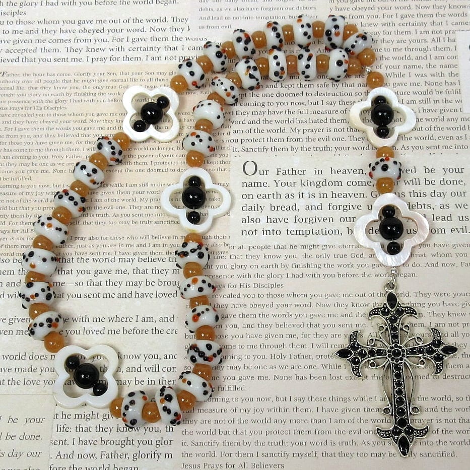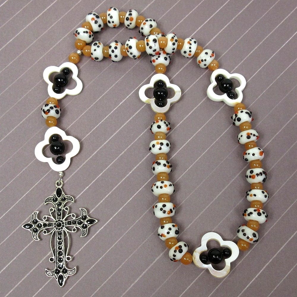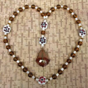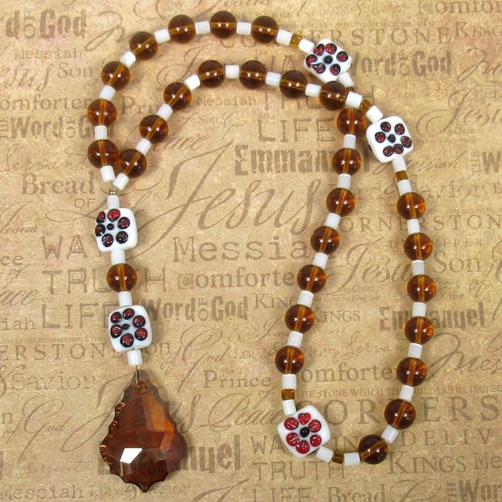 Flowered brown and white beads and a matching Swarovski crystal pendant grace this Protestant prayer bead necklace by Kristi Lyn Glass.