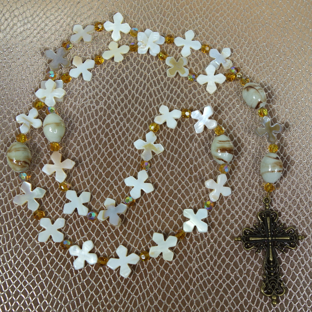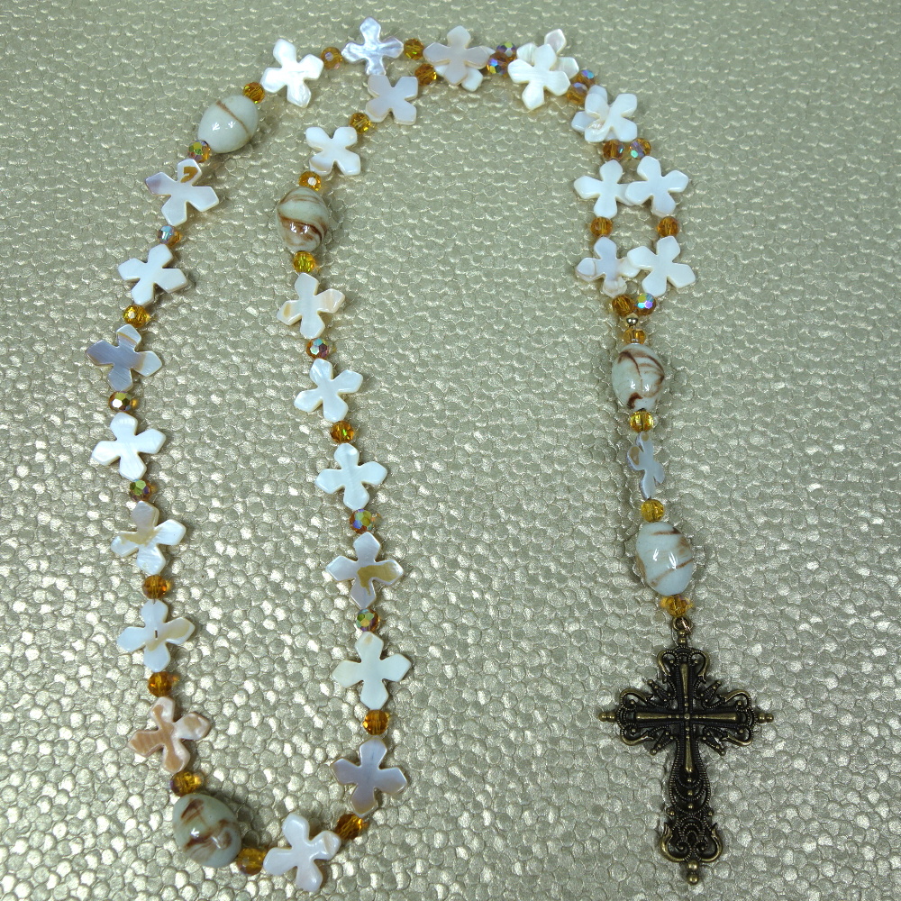 Mother of pearl shell cross Week beads, swirled cream and brown oval Cruciform beads, faceted amber glass spacer beads, and a filigreed goldtone metal cross grace this Protestant prayer bead necklace. Its ample length will make it a prominent statement of faith when worn.
