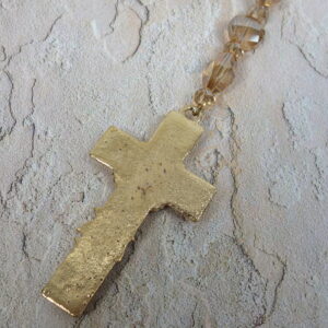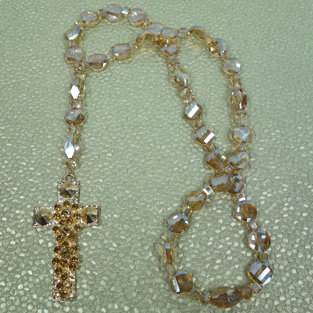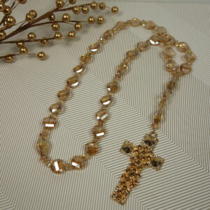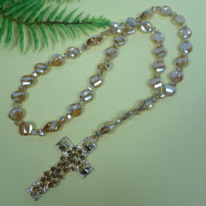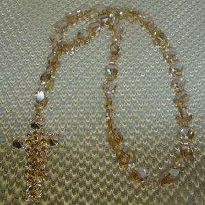 Faceted transparent golden glass bicone Cruciform beads, faceted transparent golden glass twisted round disk Week beads, faceted transparent golden glass cube spacer beads, and a golden rhinestone encrusted metal cross grace this Protestant prayer bead necklace.