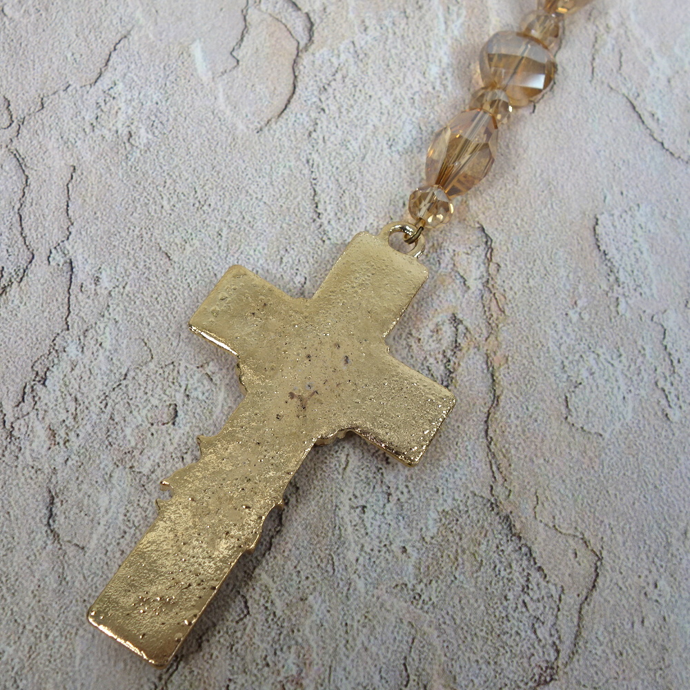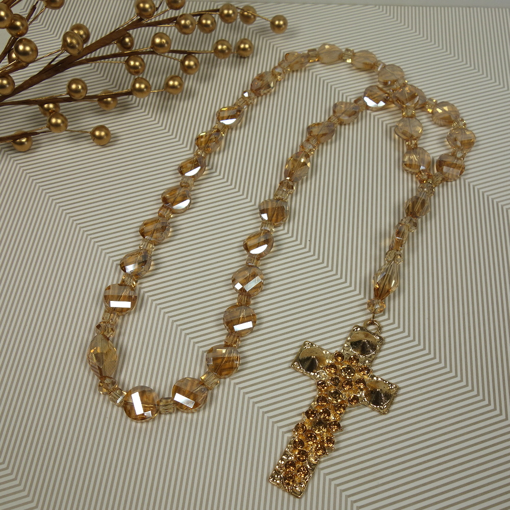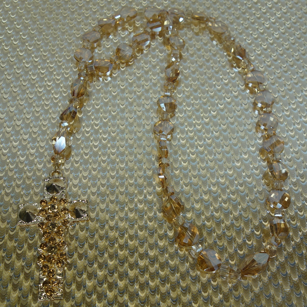 Faceted transparent golden glass beads and a matching rhinestone encrusted metal cross grace this super-blingy Protestant prayer bead necklace.