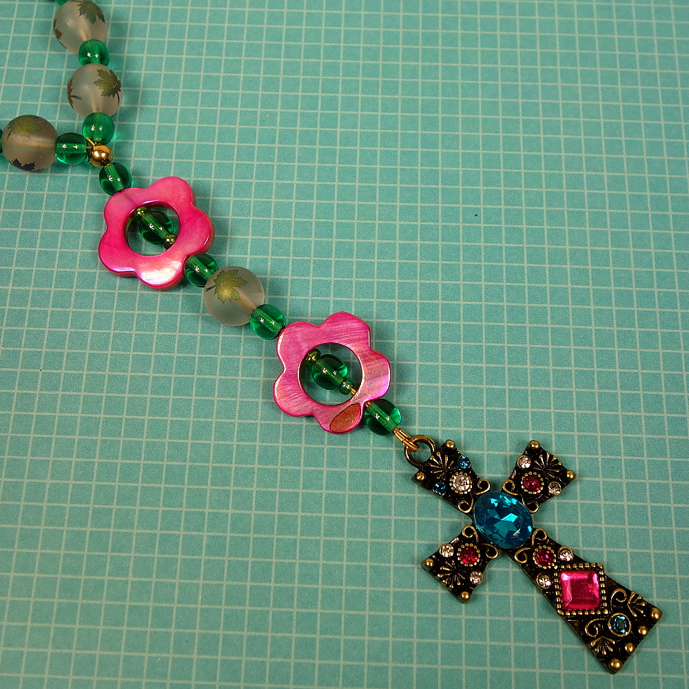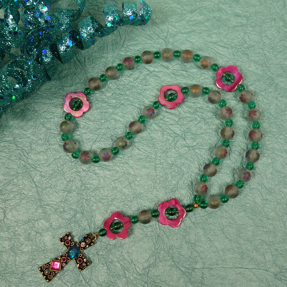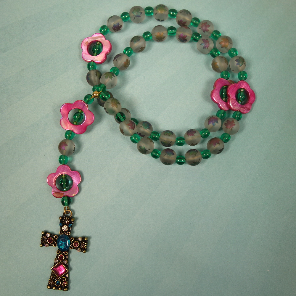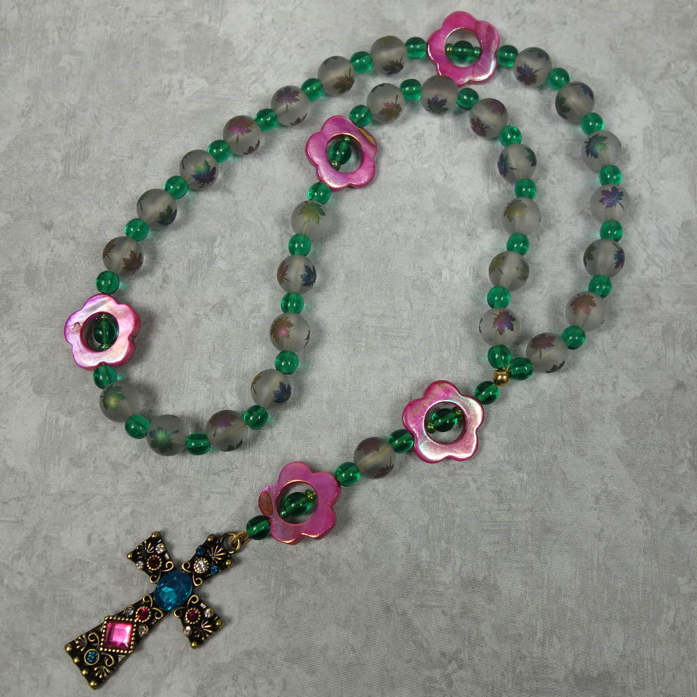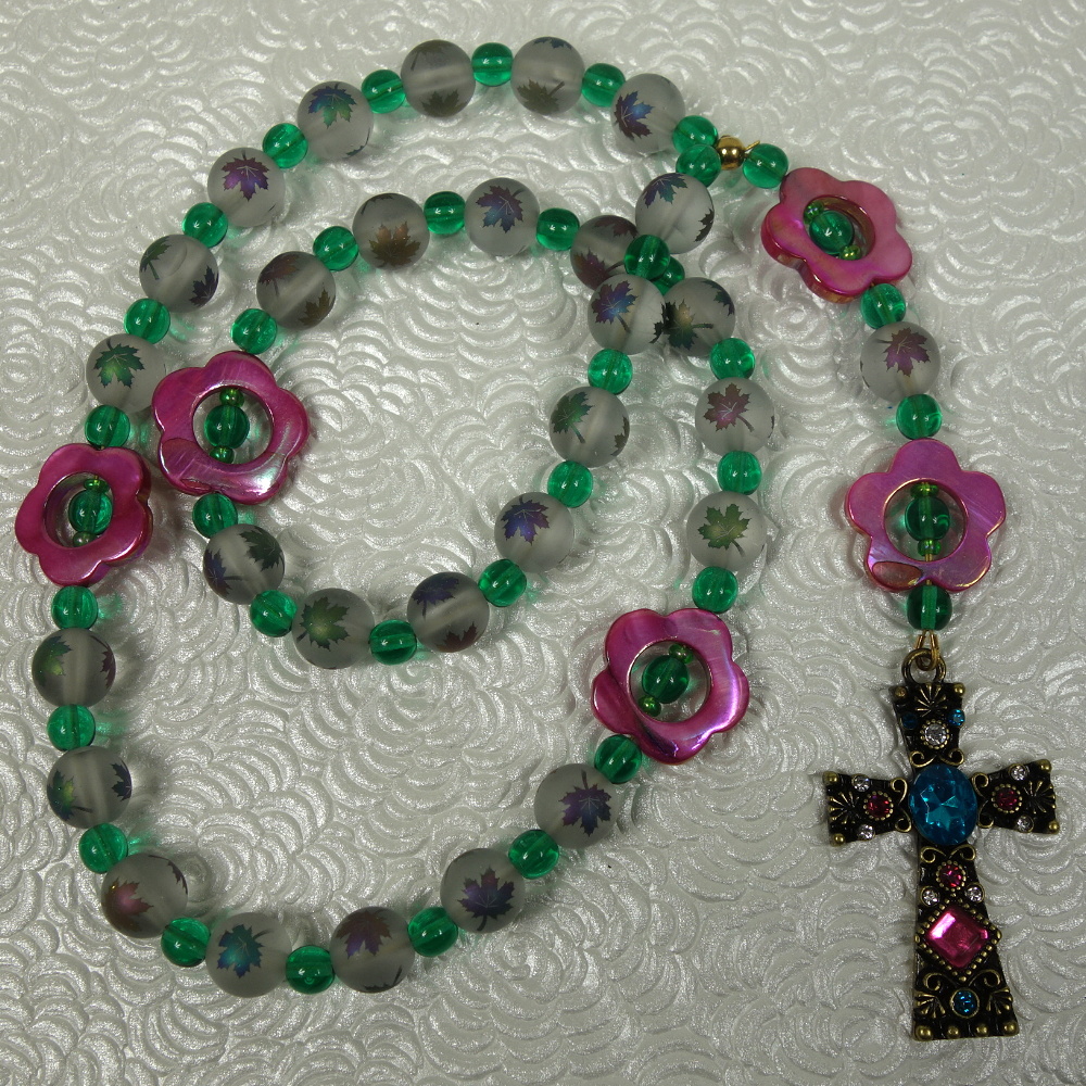 Pink shell flowers, color-changing maple leaves, and a filigreed rhinestoned cross grace these unusual pink and aqua Protestant prayer beads.