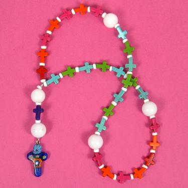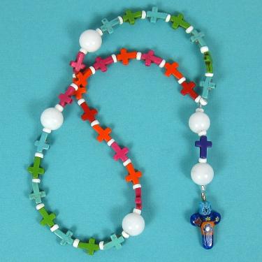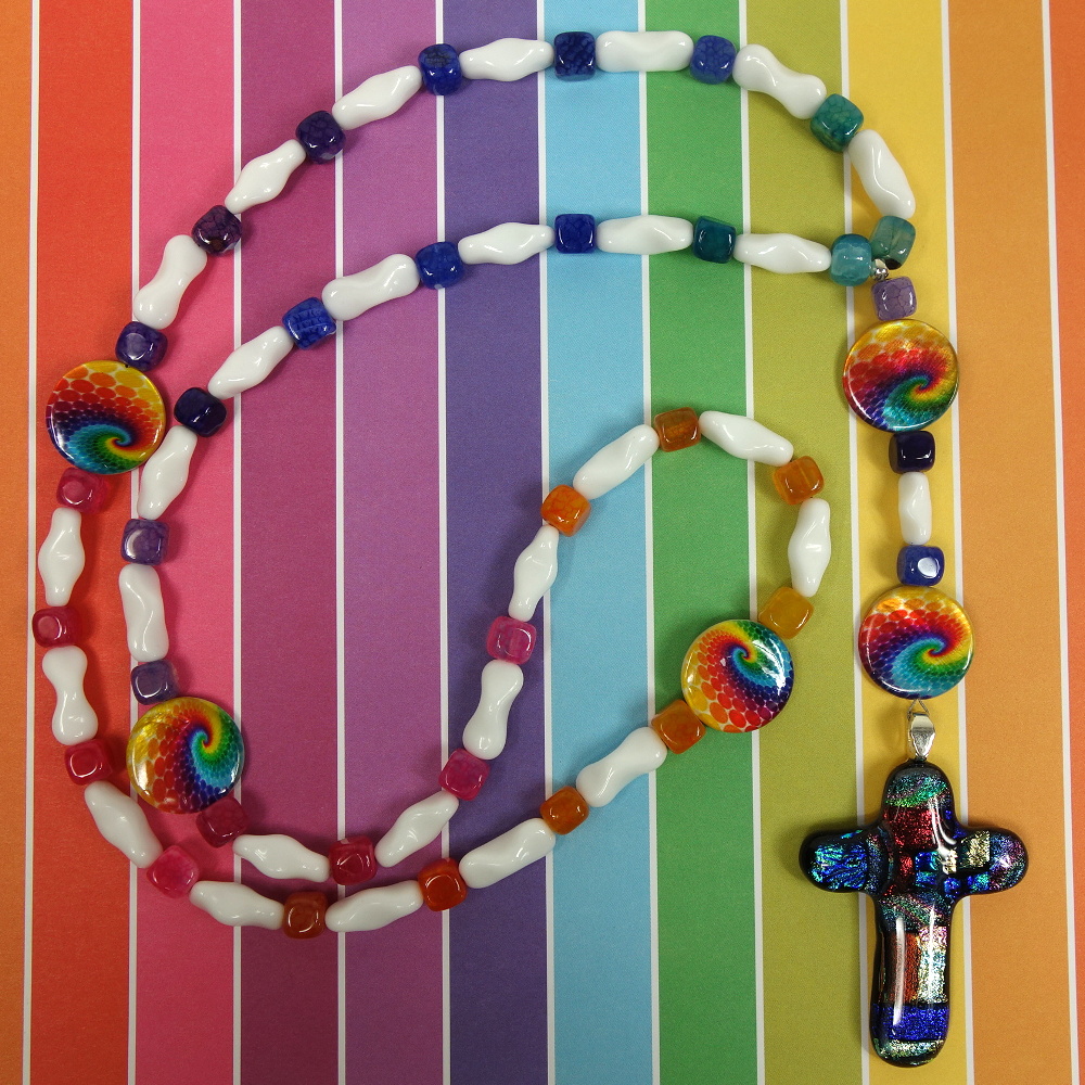 Rainbow tie-dyed disks and peace symbol beads and a red Howlite cross grace this Protestant prayer bead necklace. If you regularly pray for peace or want to make a colorful statement of faith, these prayer beads are for you!