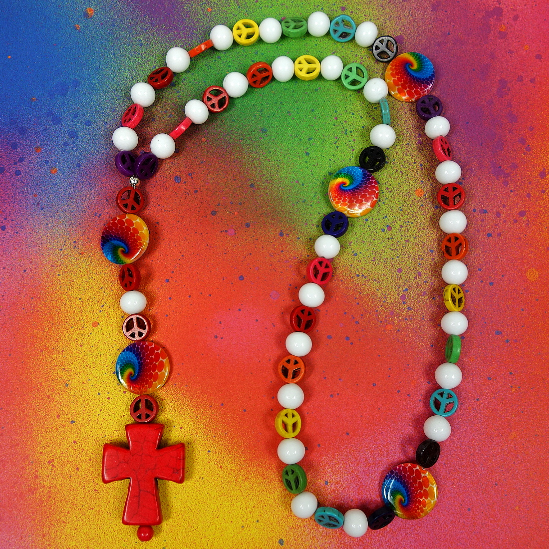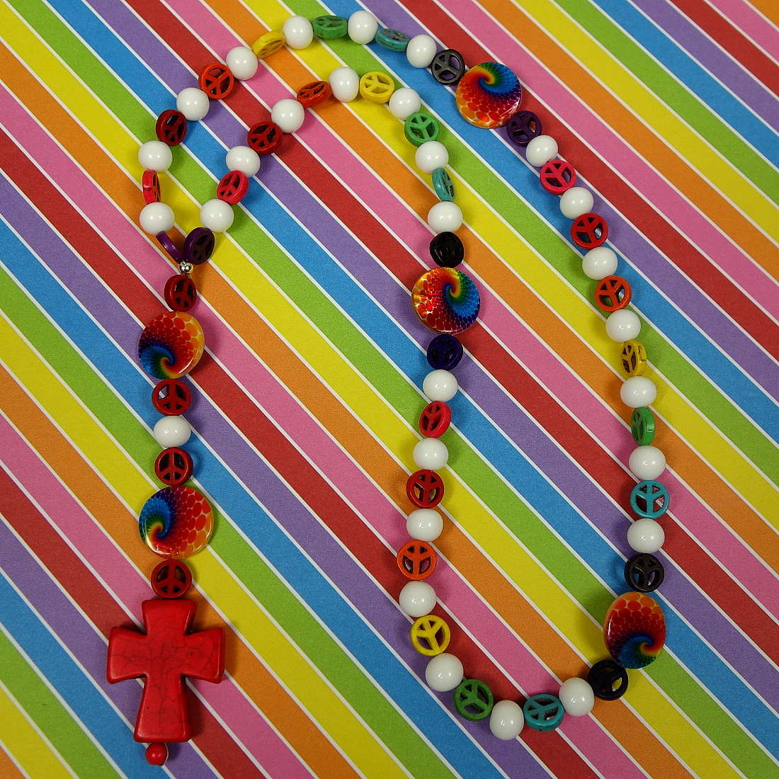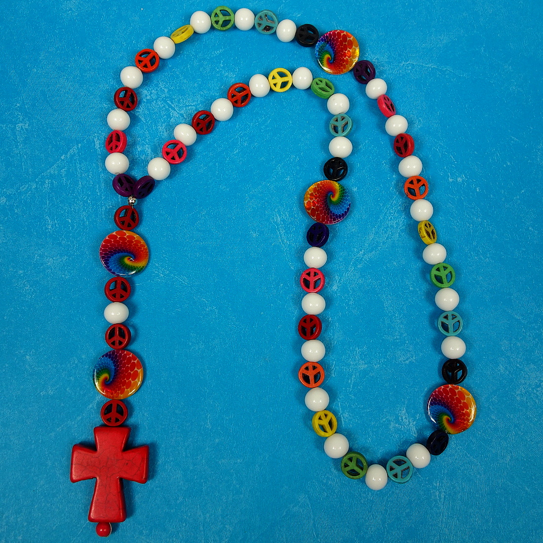 Rainbow tie-dyed disks and peace symbol beads and a red Howlite cross grace this Protestant prayer bead necklace.