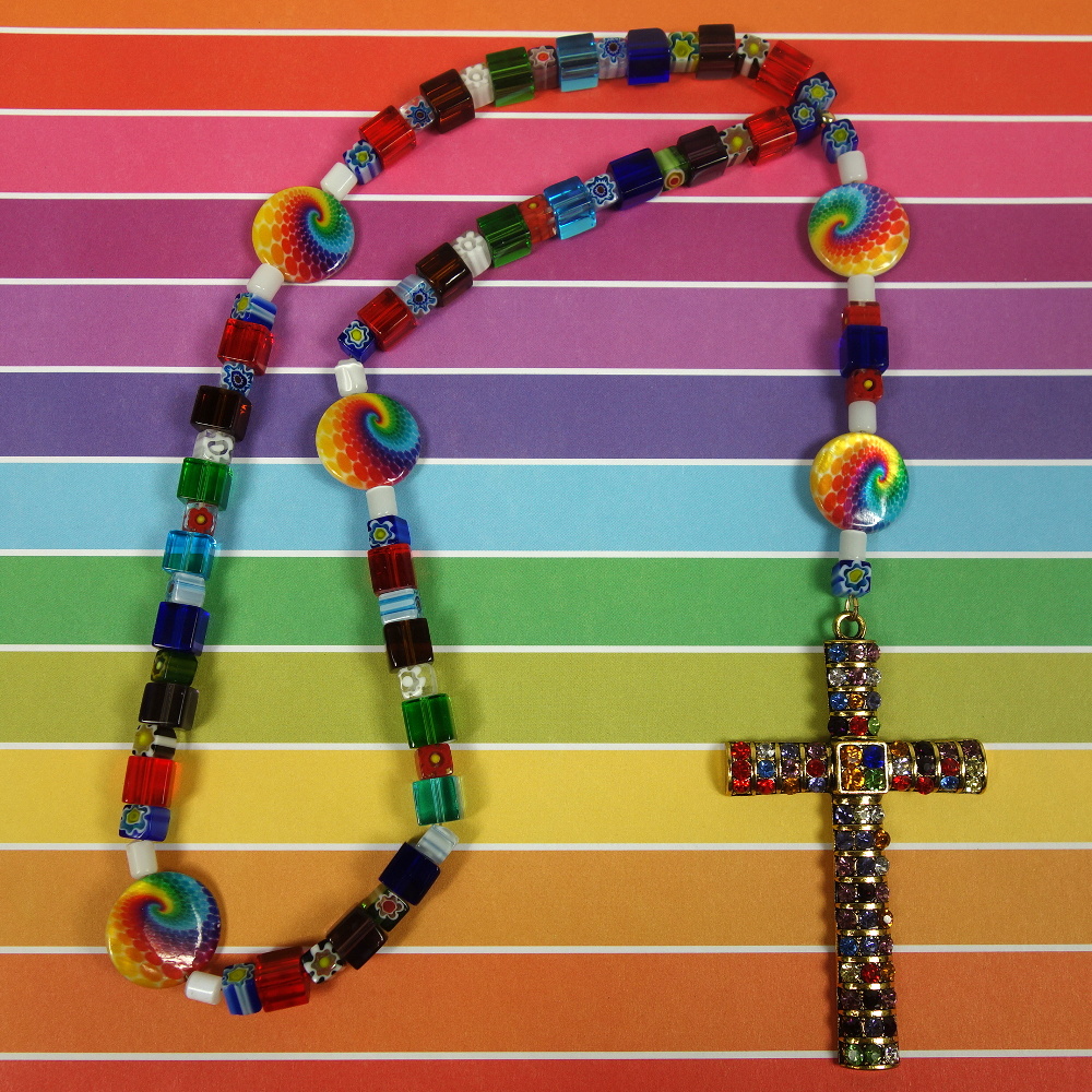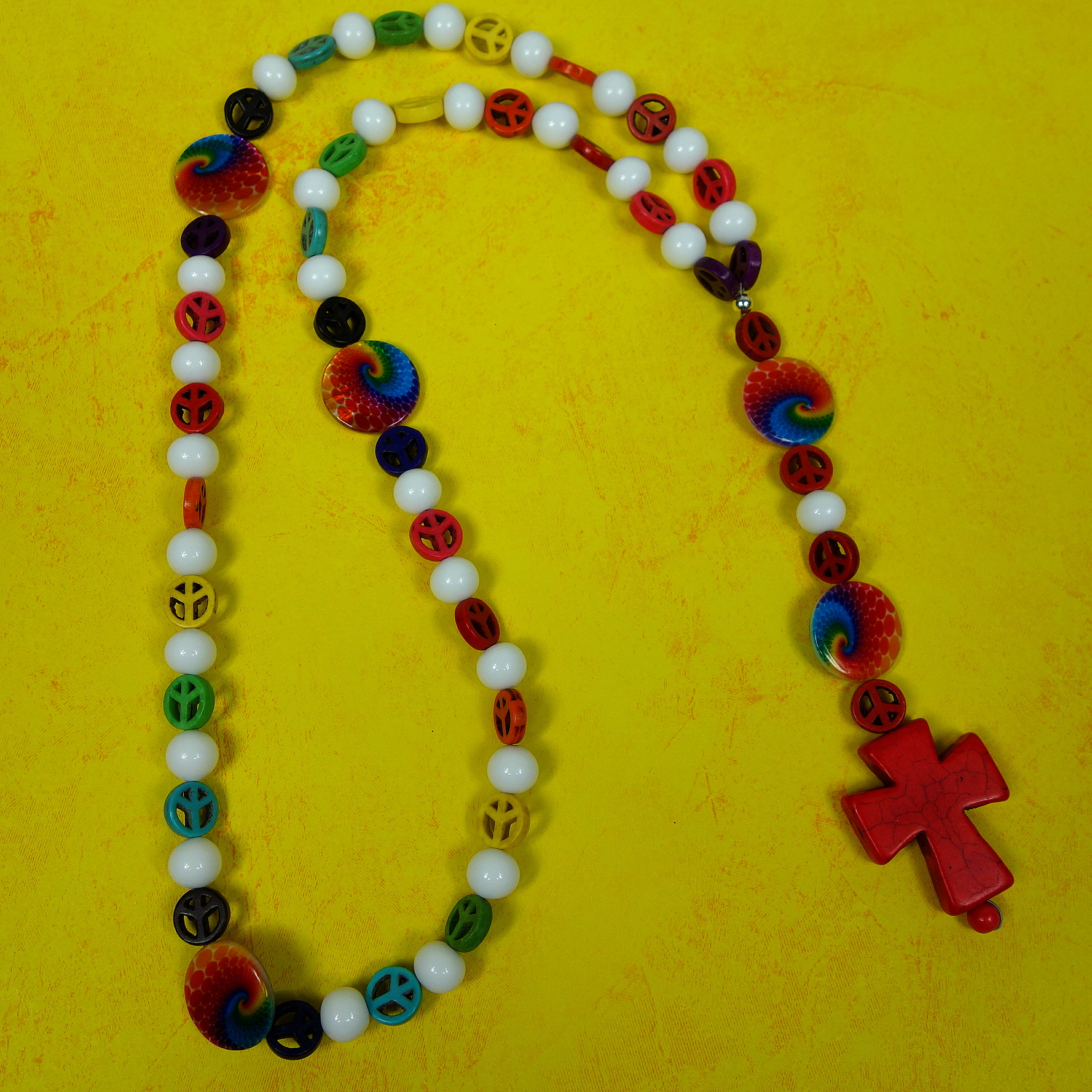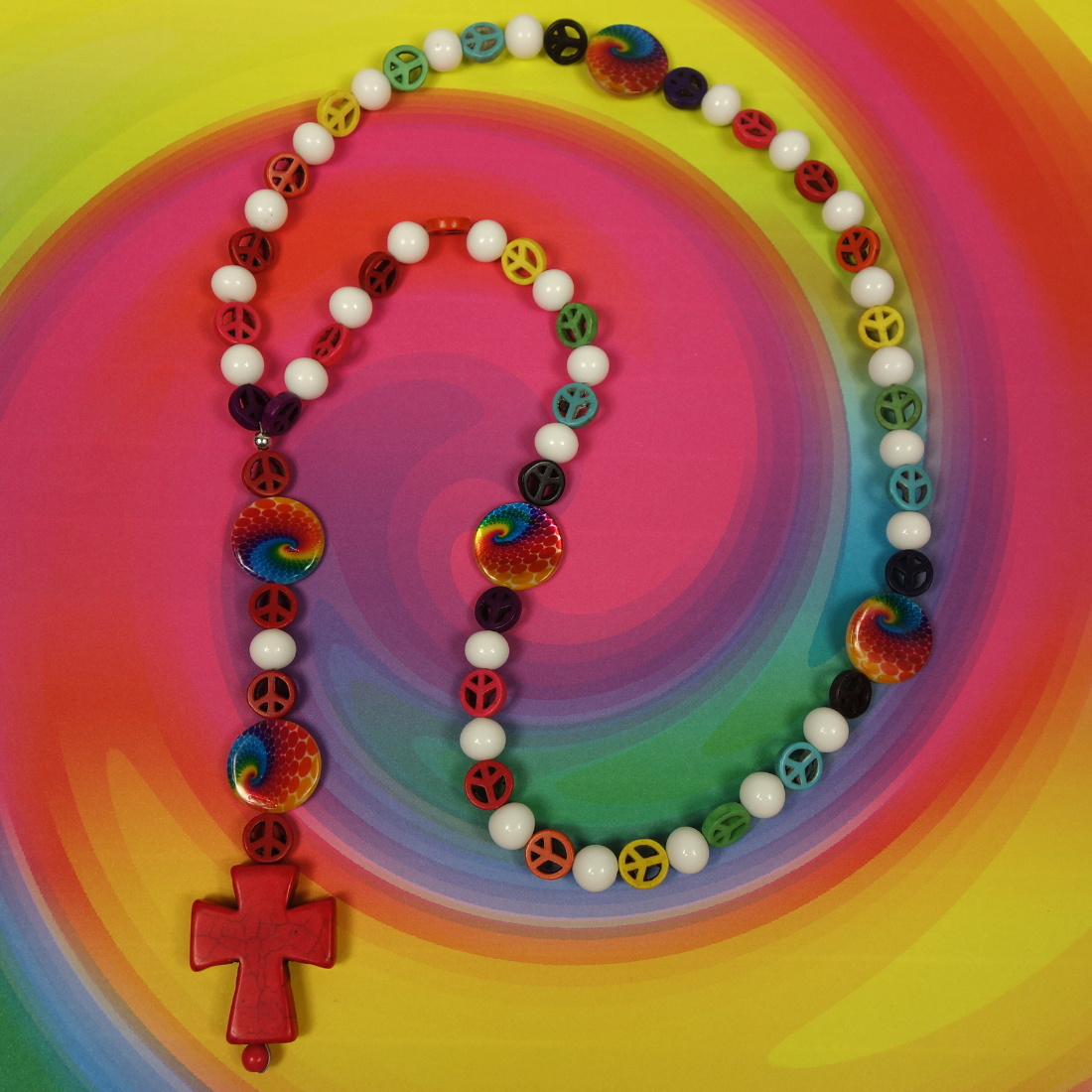 Rainbow tie-dyed disks and peace symbol beads and a red Howlite cross grace this Protestant prayer bead necklace.