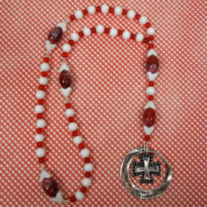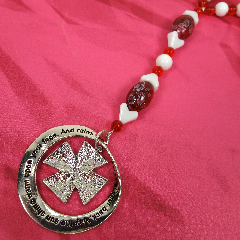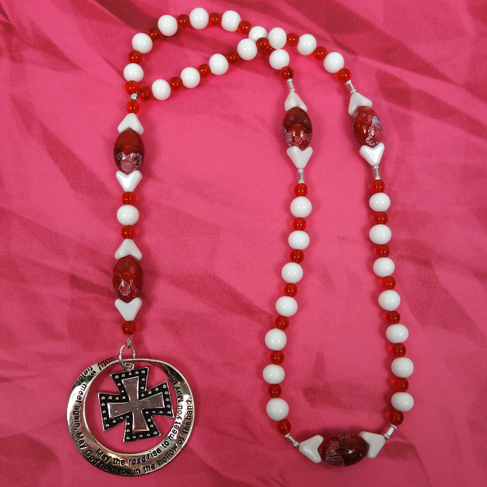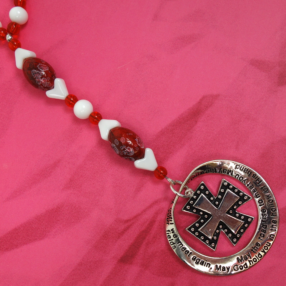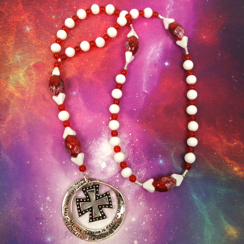 White splotched red oval glass Cruciform beads, round white Week beads, round transparent red glass spacer beads, and a prayer-ring circled embossed Swiss cross grace this Protestant prayer bead necklace. The red Cruciform beads are flanked by white glass bead cups and silver-plated dog-bone spacer beads. The silver-plated prayer ring is embossed with the prayer “May the road rise to meet you. May the wind be always at your back. May the sun shine warm upon your face. And rains fall soft upon your fields.” The ring’s twist makes this prayer repeat until infinity.